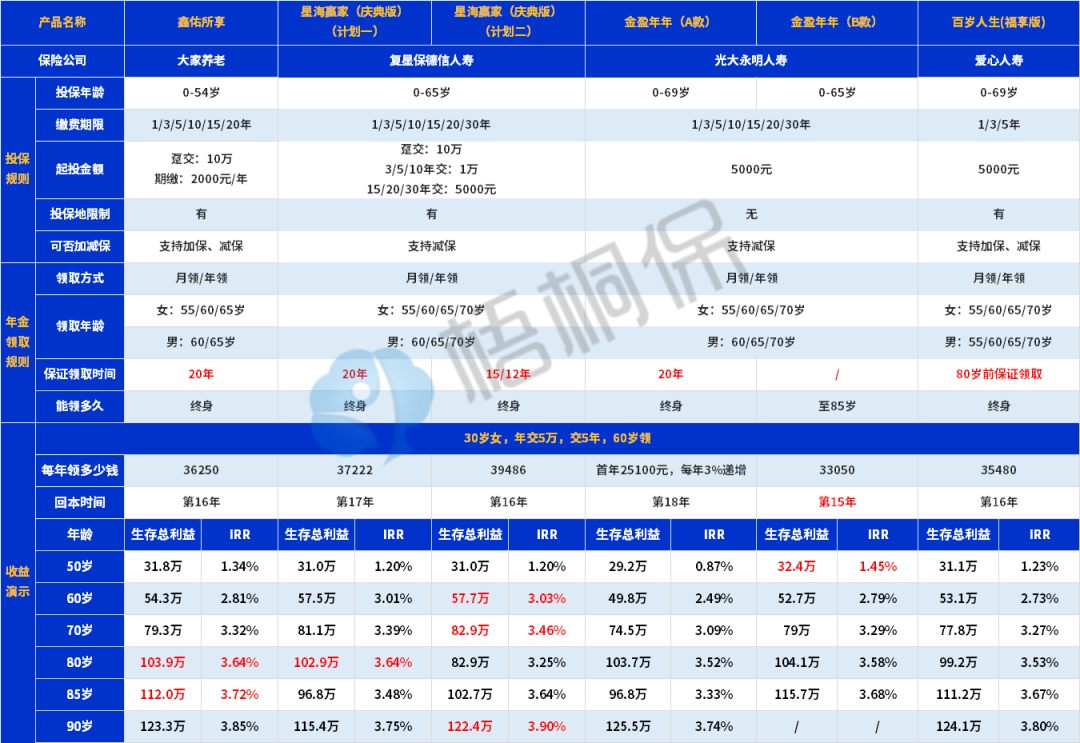 梧桐君收集了市面上几款年金险的产品,我们可以看一看它们的实际收益情况: