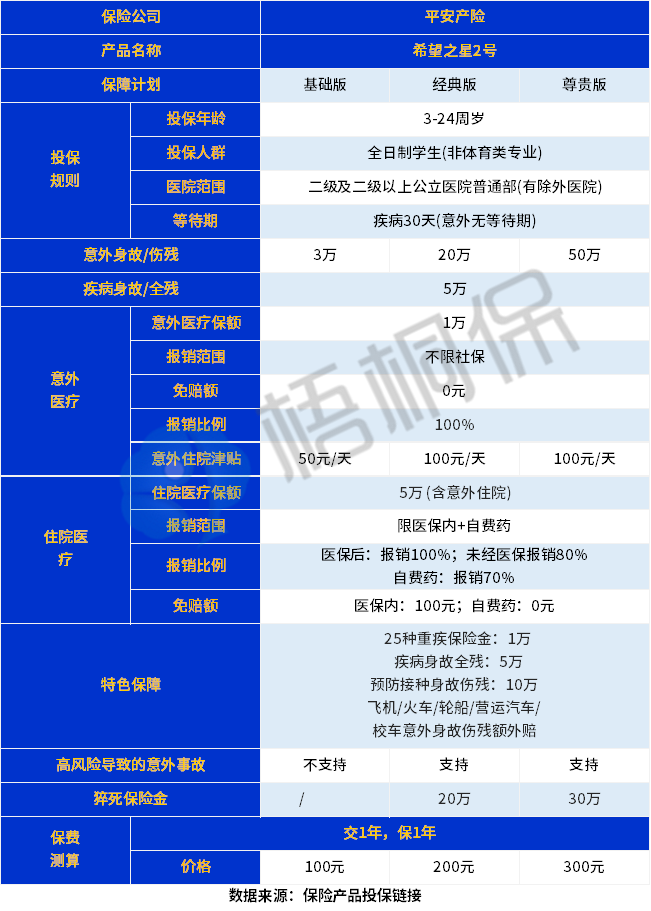 平安希望之星2号的性价比还是很高的,其保障是包含了疾病住院治疗和意外医疗保障,疾病住院医疗还包含了自费药,还有25种重疾保险金、预防接种身故全残保障和飞机、火车、轮船等意外事故伤残保障。关键是基础版保费便宜,只需要100元一年,若是希望有保障同时保费又便宜的家长可以考虑。